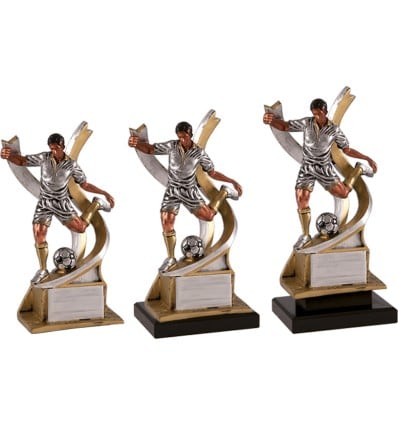 Trofeo con futbolista chutando con cinta decorativa. Figura dinámica en resina que captura la acción del disparo a puerta.