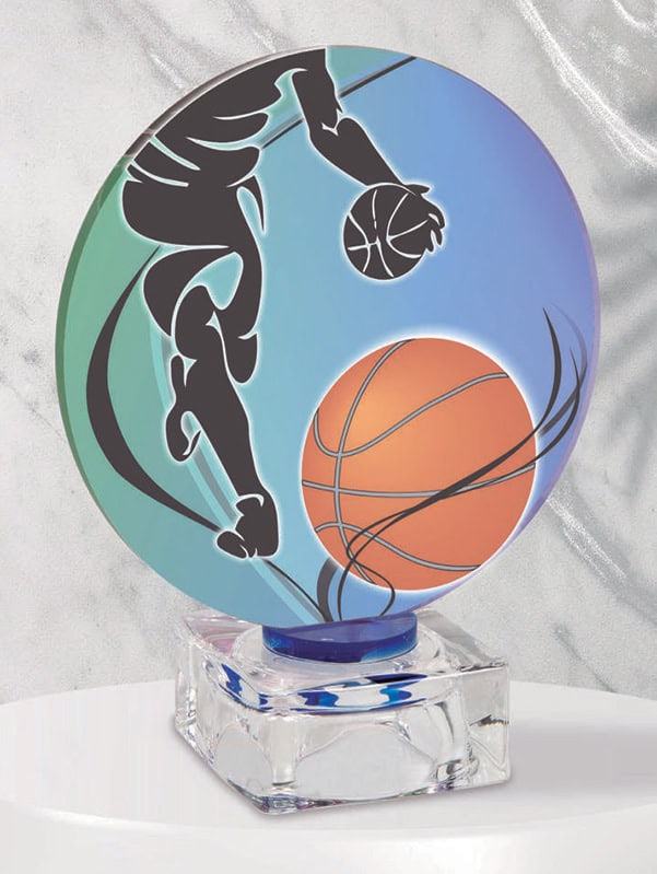 Aplique con forma de disco y base de cristal con posibilidad de poner motivo de cualquier deporte. Ejemplo mostrado baloncesto.Contamos con 7 tamaños