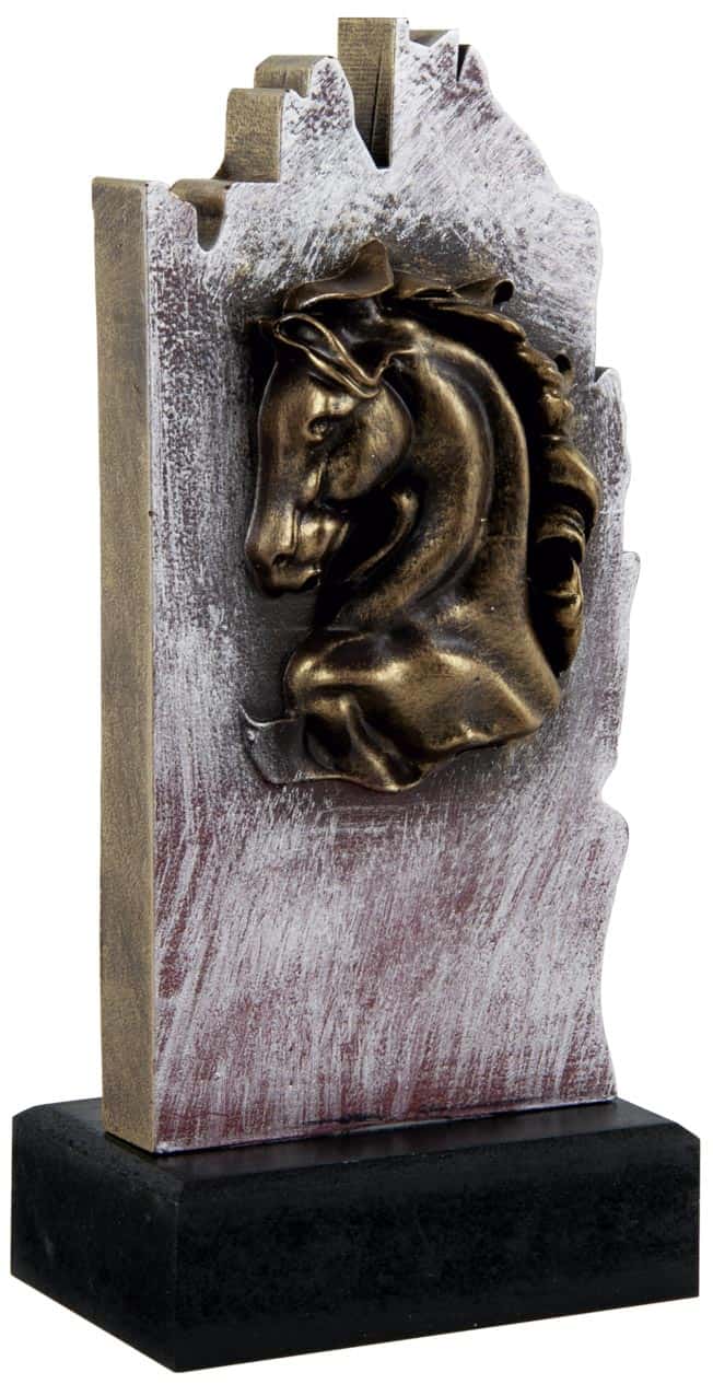 El diseño de este trofeo es moderno y sofisticado. La figura del caballo plano con picos es un detalle distintivo que lo diferencia de otros trofeos comunes. El caballo, en una pose impresionante, está representado de forma dinámica, lo que le da una sensacion de movimiento y potencia. Este diseño atractivo lo convierte en un objeto decorativo que también puede ser exhibido con orgullo por los ganadores.