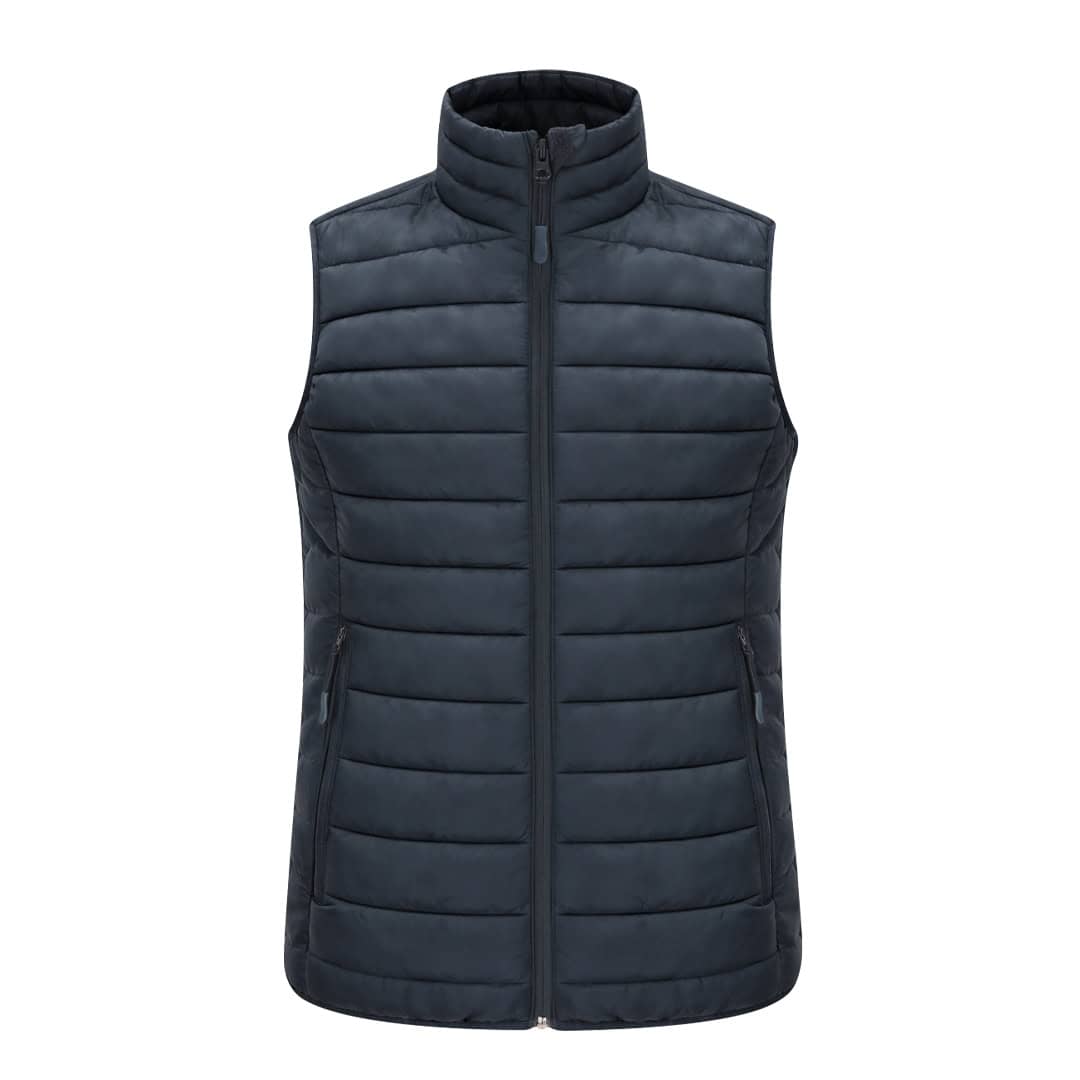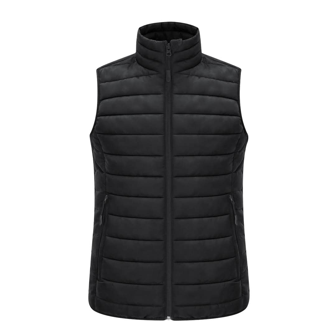 Chaleco acolchado de mujer en material extra ligero, compacto y de corte entallado. Resistente al agua y cortavientos, con suave relleno y forro interior. Cierre de cremallera invertida y tirador a juego. Cuenta con 2 bolsillos laterales con cremalleras y tirador a juego y 2 bolsillos interiores. Sisa y cintura con ribete elástico a tono. Incluye práctica funda de transporte.