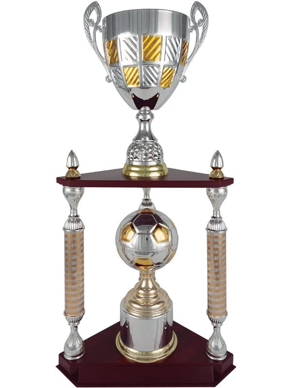 El diseño de este trofeo se distingue por sus tres columnas que brindan una sensacion de altura y estabilidad, mientras que el patron damero agrega un toque de modernidad. La figura que corona el trofeo captura la accion deportiva, haciendo que este trofeo sea más que un simple premio, sino una pieza memorable que resalta el esfuerzo de los campeones.