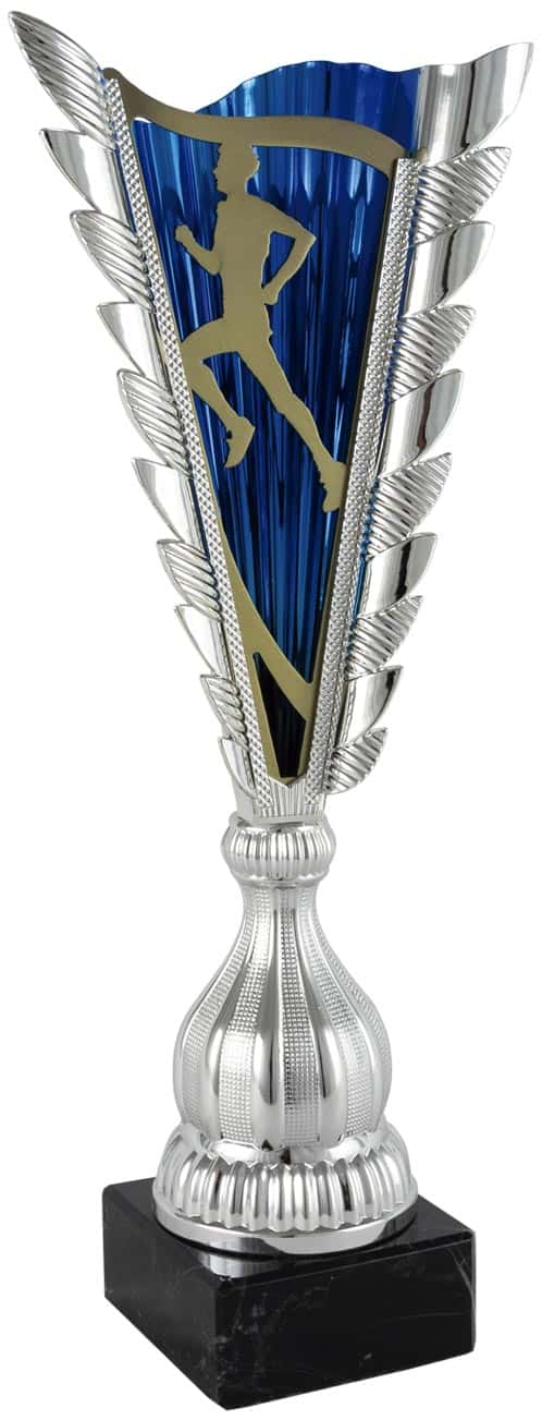 TROFEO CONO AZUL BANDAS CON APLIQUE 08308. POSIBILIDAD DE PONER MOTIVO DE CUALQUIER DEPORTE. PEANA DE MARMOL.DEPORTE REPRESENTADO DE MUESTRA ATLETISMOTRES TAMAÑOS DISPONIBLES