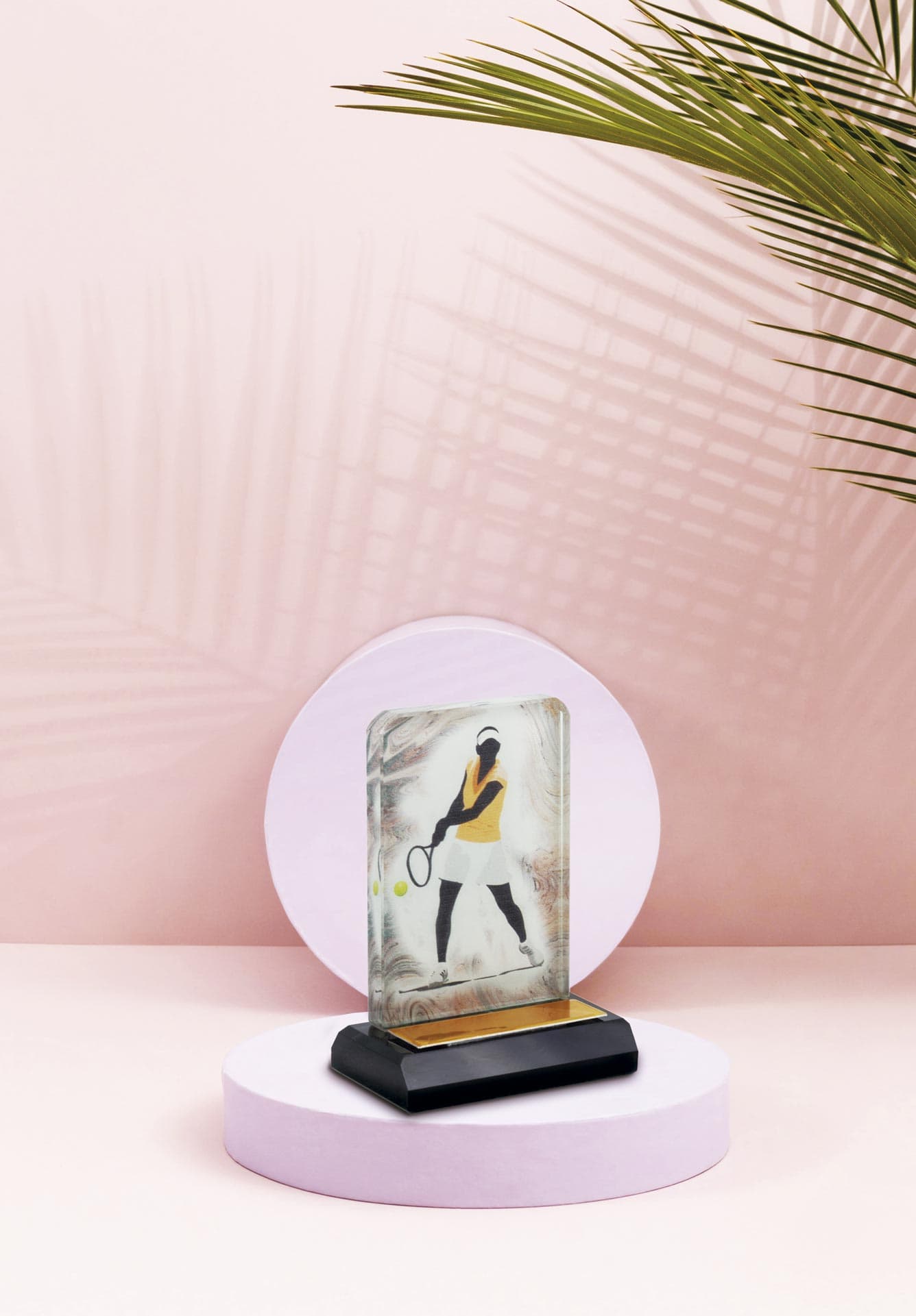 TROFEO CRISTAL COLOR BASE CRISTAL NEGRA. REF. 1382. POSIBILIDAD DE PERSONALIZAR CON MOTIVO DE CUALQUIER DEPORTE O LOGOTIPO. DEPORTE REPRESENTADO TENISALTURA 9 CM