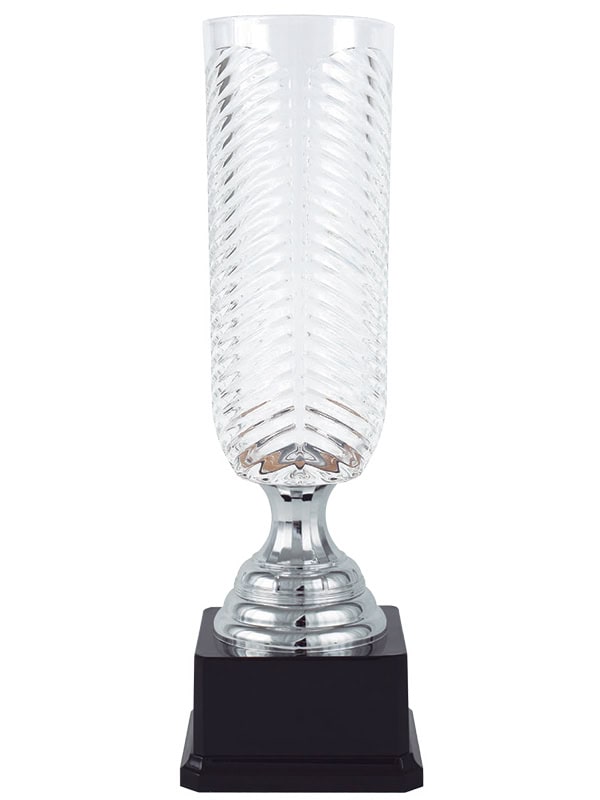 Trofeo de cristal con forma de jarron cilindrico rayado y peana de material acrilico. Contamos con 3 tamaños