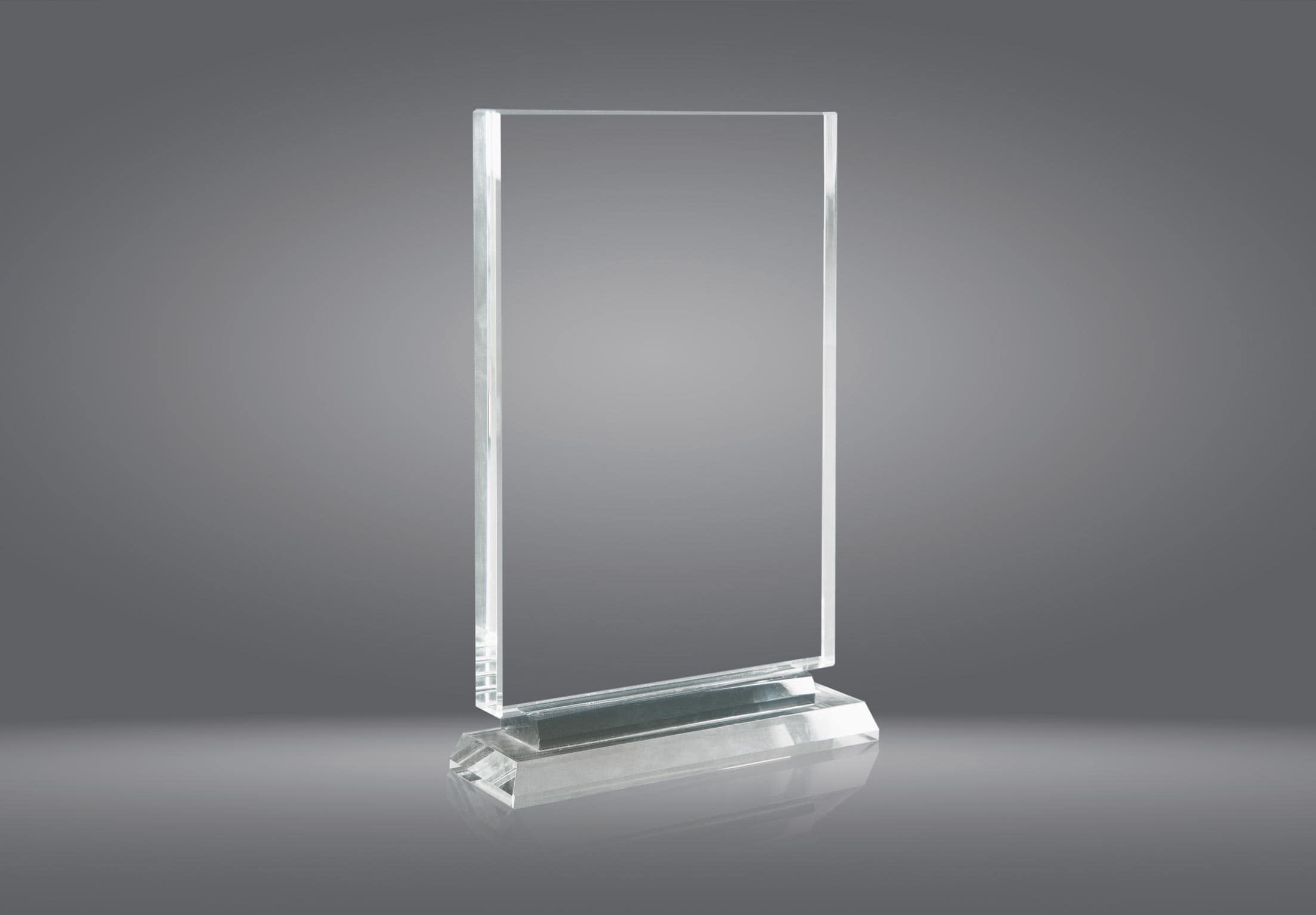 Elegante trofeo de cristal rectangular sobre base de vidrio. Perfecto para entregas de premios y agradecimientos.