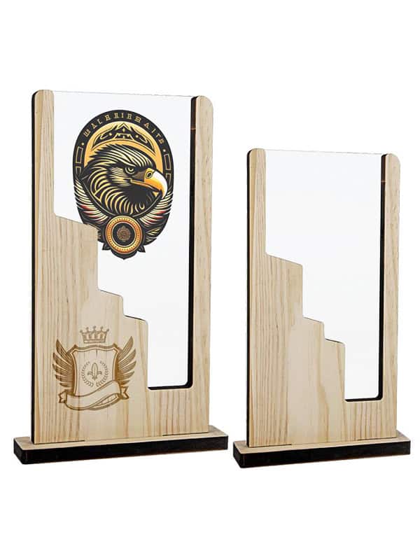 Trofeo de madera y metacrilato. El grabado se hace mediante impresion a color. Contamos con 3 tamaños