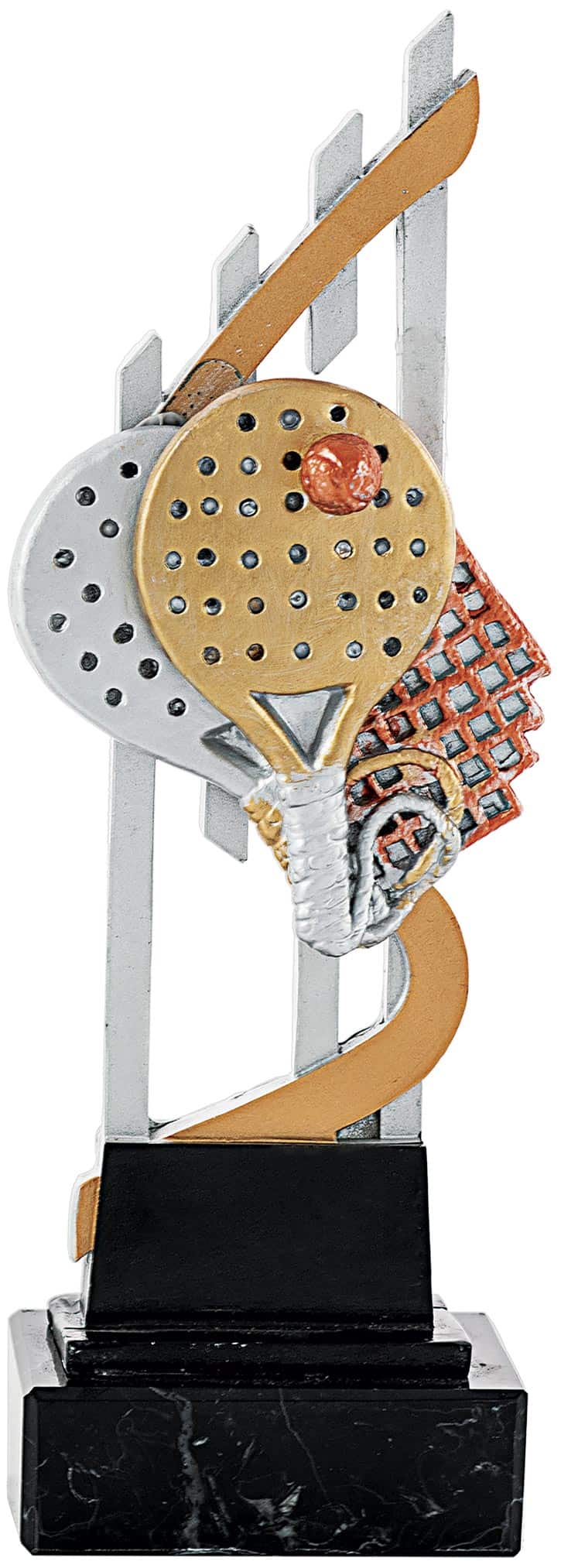 El Trofeo Pádel Soporte Barras es un premio que sobresale por su diseño moderno. Sus barras de soporte le dan un toque distintivo y elegante, perfecto para torneos de pádel. Este trofeo incluye una raqueta y una pelota en su estructura, conectando directamente con el deporte. Hecho con materiales de calidad, su acabado brillante capta la atencion en cada entrega. Personalizalo con nombres, fechas o el logo del evento para un resultado especial. Es ligero, fácil de transportar y se ve genial en vitrinas o estantes. Si buscas un trofeo que combine estilo y resistencia, este modelo es una gran eleccion.
